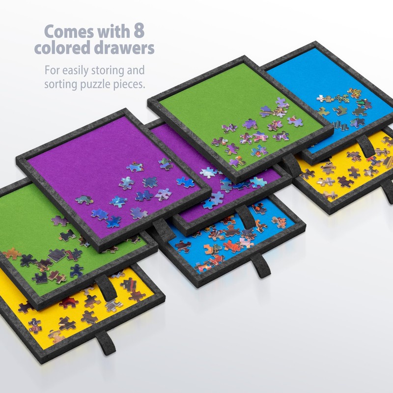 - Features 8 Drawers & 4 Casters - Keep your pieces organized with the 8 sorting drawers that allow you to sort by color, shape, or pattern to speed up assembly. The bottom shelf offers extra storage space for puzzle boxes or other items. Four lockable wheels enable you to easily move the table anywhere you like and ensure stable placement.