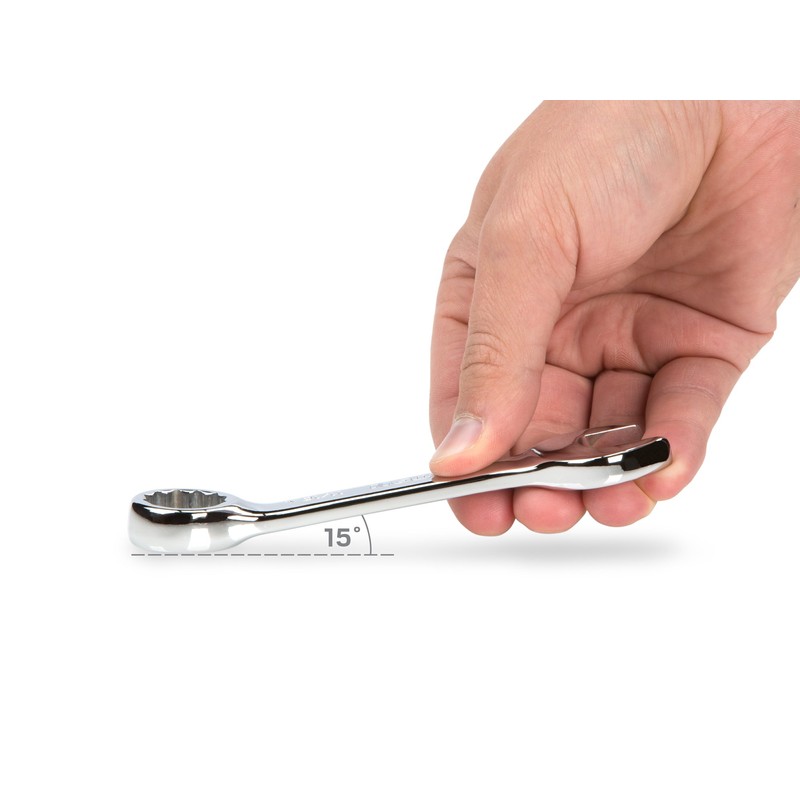 - 12-point box end doubles the access angles of a 6-point and is offset 15 degrees to create clearance for fingers