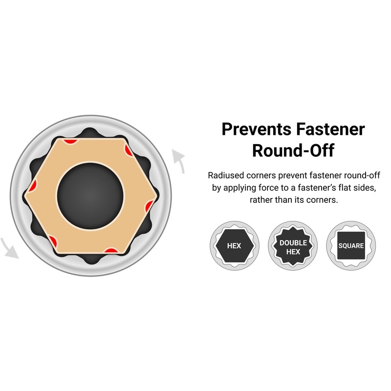 • Socket geometry is designed to apply force to flat sides of fasteners and not the corners, preventing round-off