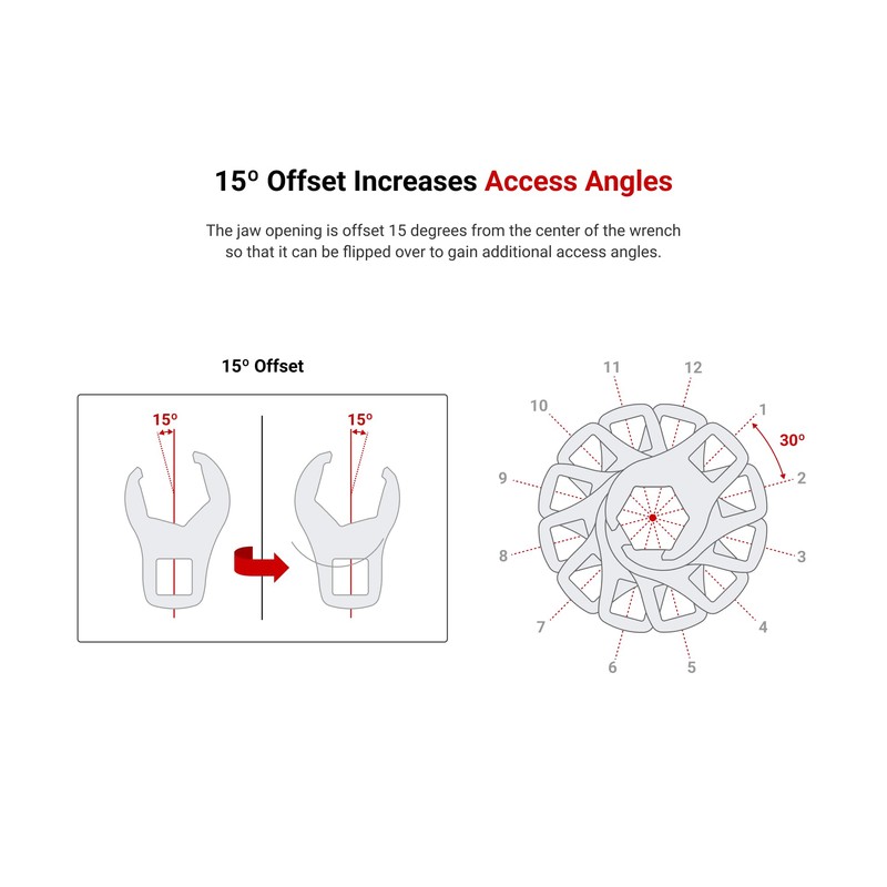 - 15-Degree Offset Increases Access Angles – The jaw opening is offset 15 degrees from the center of the wrench so that it can be flipped over to gain additional access angles