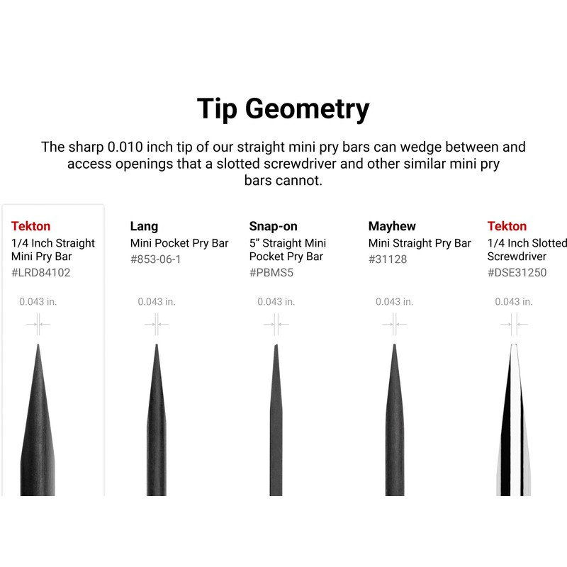 - Tip Geometry – The sharp 0.010 inch tip of our straight mini pry bars can wedge between and access openings that a slotted slotted screwdriver and other similar mini pry bars cannot