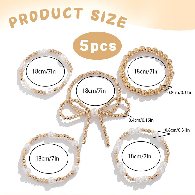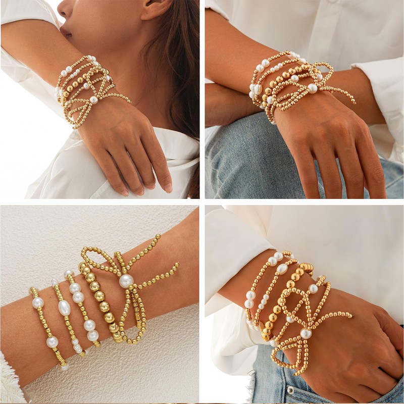 TELAIN Bracelet Ladies Gold, Set Of 5 With Adjustable Size, Lightweight Gold Bangle Made Of Imitation Pearls For Elegant Style And Various Occasions