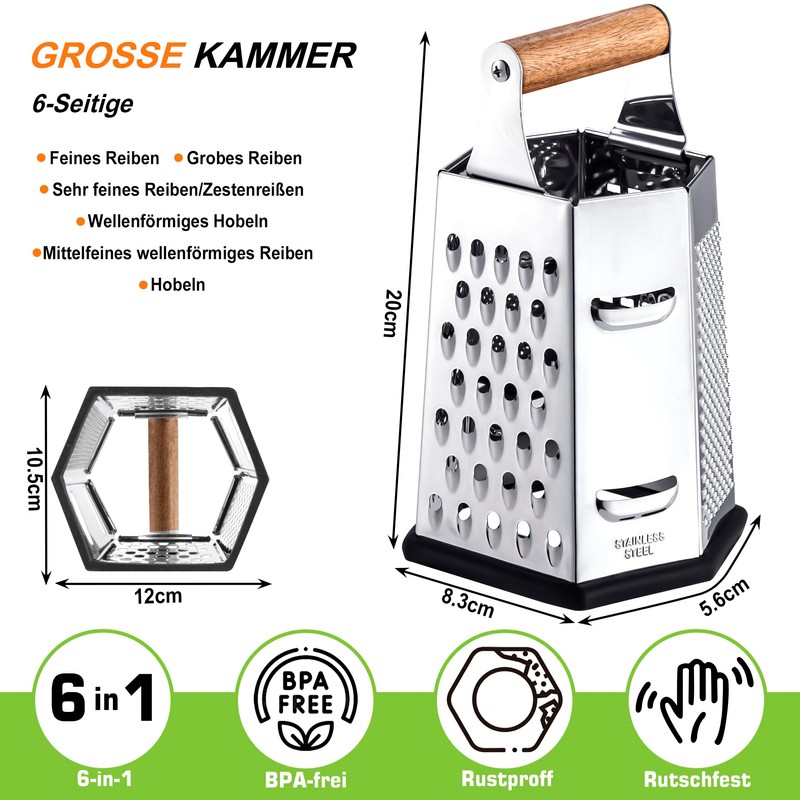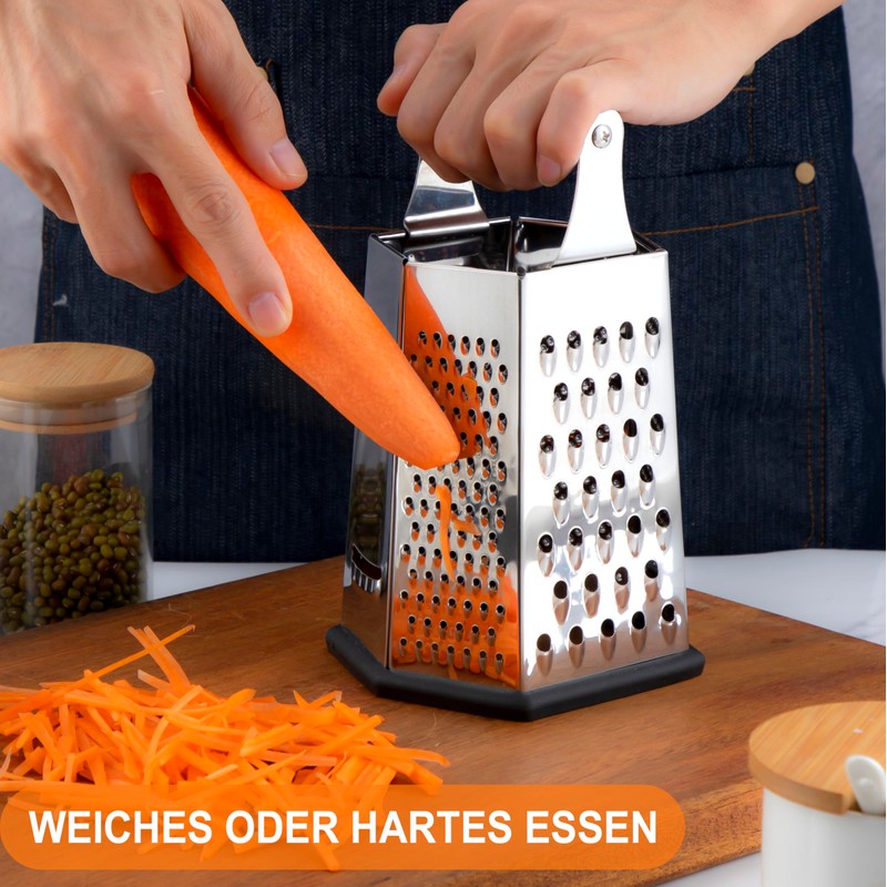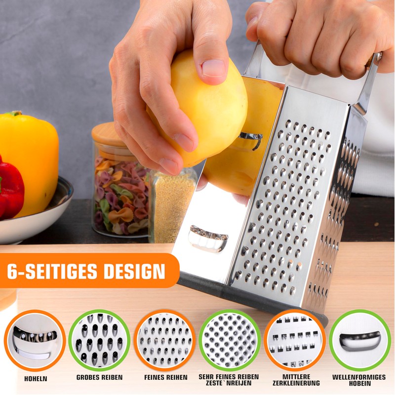 - 6-in-1 multifunctional design: all-purpose grater with 6 important functions for daily grating, cutting, rasping and zesting. As a parmesan grater, cheese grater, vegetable grater, potato grater. Perfect for grating cheese, carrots, vegetables, parmesan, nutmeg, ginger, garlic, chocolate, coconut.