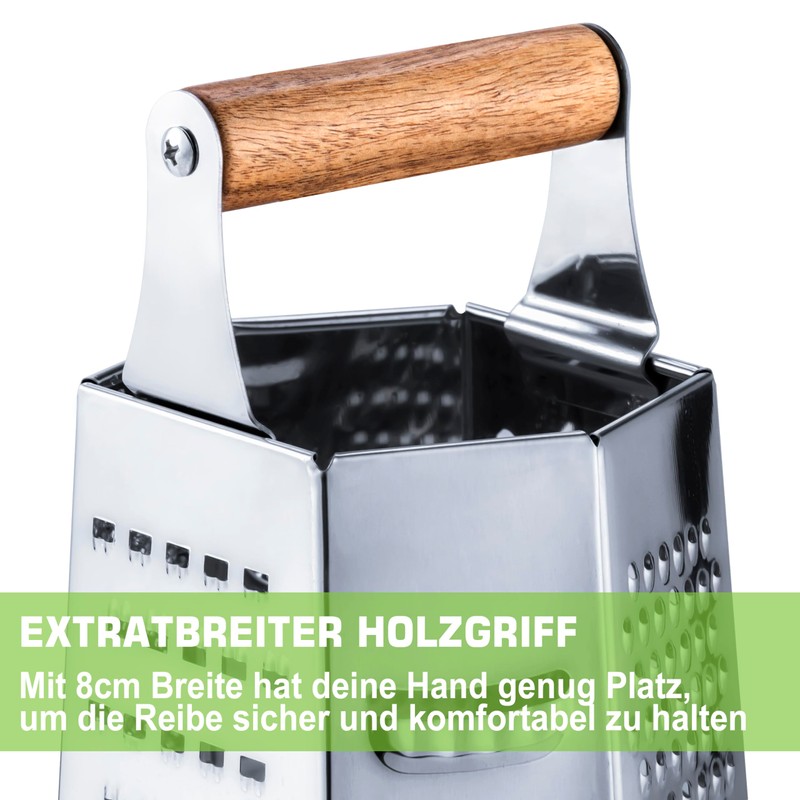 - Efficient work: the base of the grater has a non-slip, scratch-resistant silicone rubber base that provides a good grip when rubbing on kitchen surfaces and does the job quickly. The widened base and ergonomic, durable wooden handle ensure maximum control and grip.