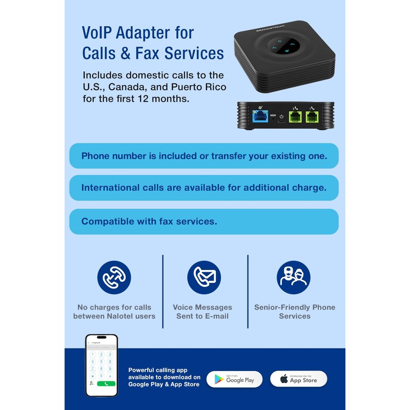 - Unlimited Calling: Enjoy unlimited calls to the U.S., Canada, and Puerto Rico for the first 12 months. New Phone Number or Porting: Get a free new phone number or easily port your existing number. Domestic & International Calls: Make and receive both domestic and international calls. Free Calls Between Nalotel Users: Calls between Nalotel users are free, both domestically and internationally.