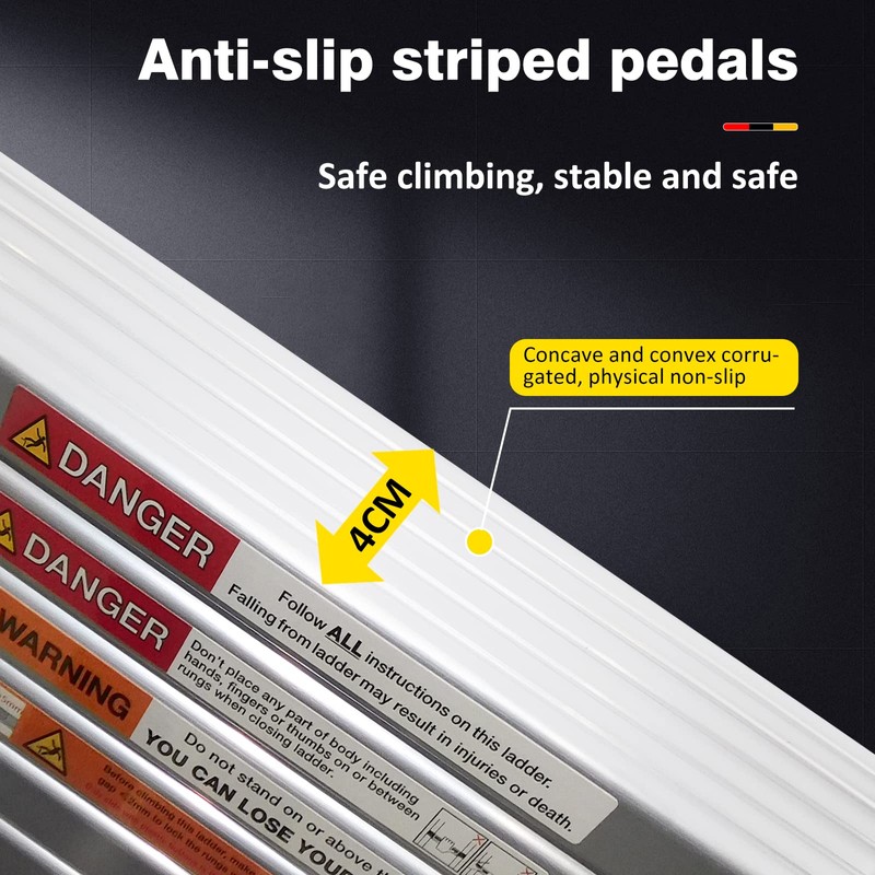 • Safety & Stability: The retractable ladder is made of high-quality stainless steel,which has corrosion resistance and rust resistance.There are anti-skid strips on the surface of each pedal,and anti-skid pads on the bottom of the ladder.