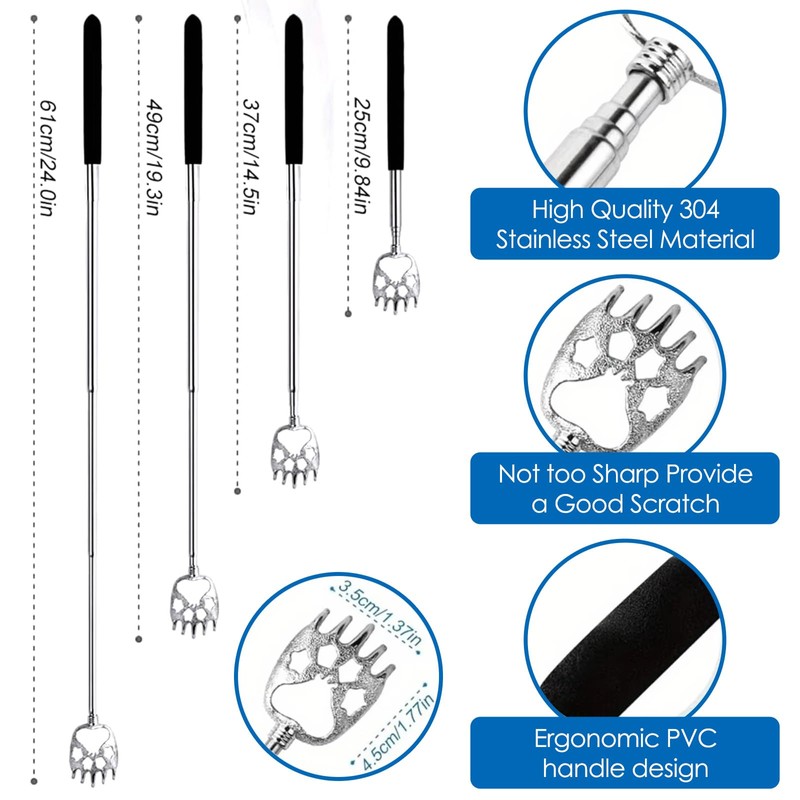 - 【Versatile Back Scratcher Kit】This telescopic back scratcher set includes 5 interchangeable heads: Bear Claw, Eagle Claw, Steel Harrow, Silicone Harrow, and Flat Silicone Back Scratcher with silicone bristles, allowing you to choose the perfect head for your scratching needs.