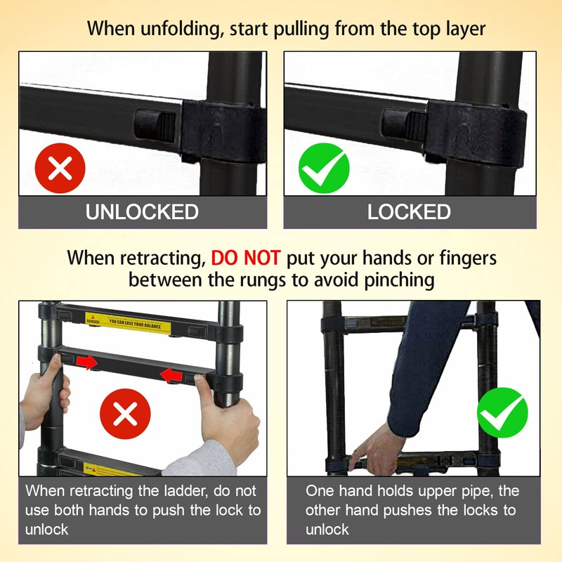 2. Confirm each section of the fasteners in two side is automatically locked before you start climbing on it.