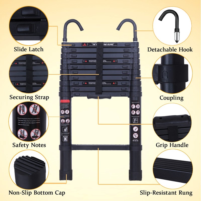 Telescoping Ladder 10.5FT/3.2M Aluminum Black Telescopic Extension Ladder Retraction Portable Lightweight Folding Ladder with EN131 Certified with 2 Detachable Hooks Delicate Design 330lb Max Load