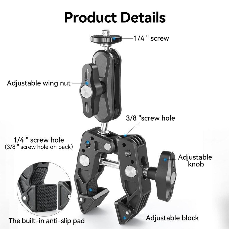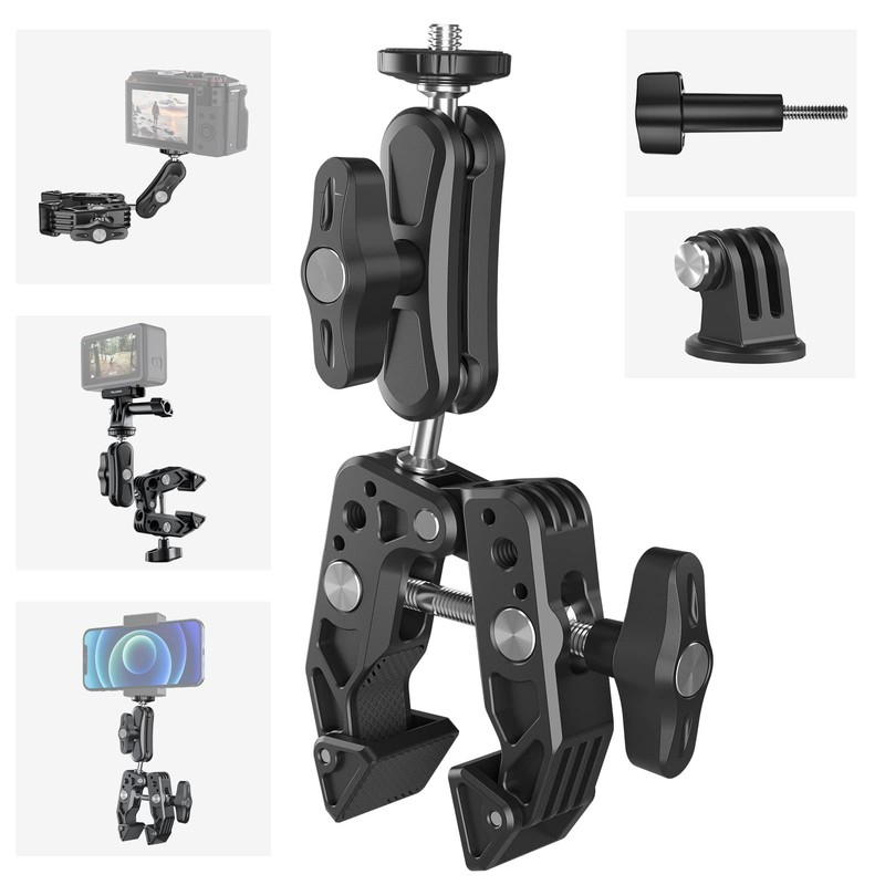 - 【Built with 1/4” and 3/8” Thread 】 Standard 1/4” and 3/8” female thread on the back-side of clamp help you to mount a small action camera, monitor, LED video light, microphone, speedlite, and more.