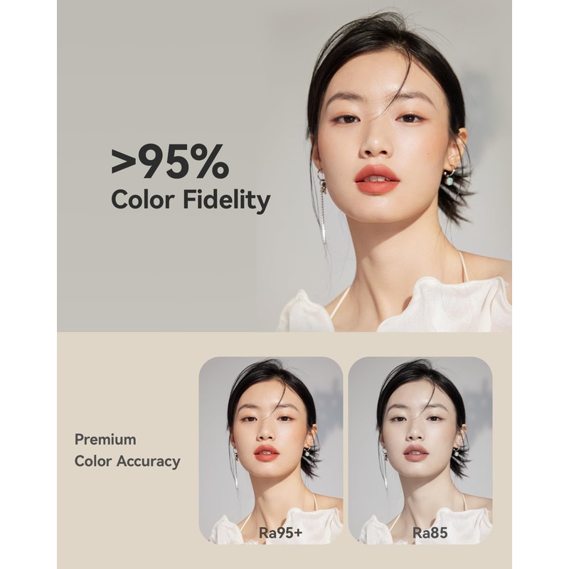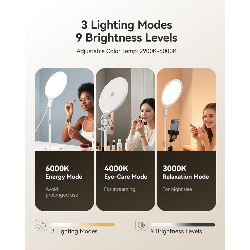 - Diverse Eye Care Lighting Options: The desktop ring light has 3 color modes 3000K-6000K (3000K Energy Mode, 4000K Eye-Care Mode, 3000K Relaxation Mode) and 9 levels of brightness, allowing you to easily adjust the color temperature and brightness to meet your needs. With a color rendering index (CRI) of up to 95+, it can significantly improve the quality of your photos and videos