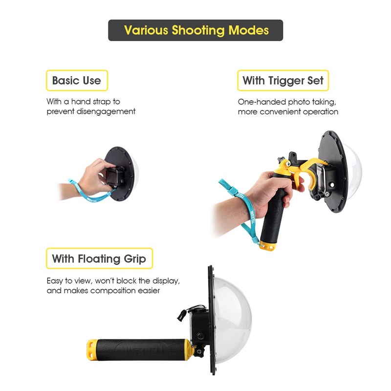 - Enjoy taking those epic shots over and under the water with help from TELESIN underwater dome port. Makes it easy to take distortion-free photos under the water or half above and half below.