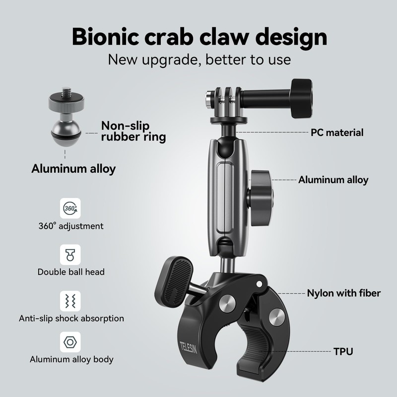 - Improved material: This claw clamp mount is made of aluminium alloy + nylon fibre material, which is more stable than ordinary bicycle tube clamps, so you can take high-quality and stable video pictures when driving or during movement activities.
