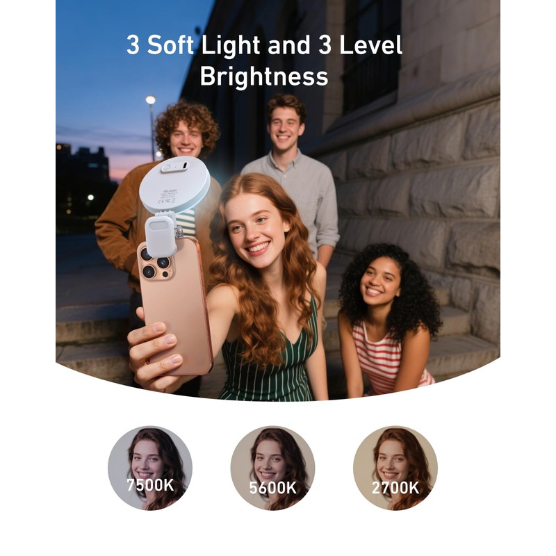 - Soft Light Incredible Photo QualityPhone selfie ring light offers 3 soft color temperatures(2700K cozy warmth/5600K natural glow/7500K chic cool), 3 levels of brightness adjustment. With a simple tap, elevate the appearance of skin and eyes in your photos and videos, creating captivating lighting effects for visually striking content.