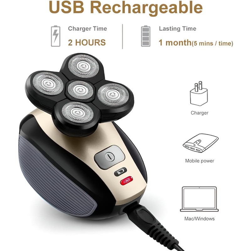 - 5-Direction Floating Heads: Ultra-flexible pivoting blades for extra reach, and multi-directional shaving, and the 5D rotary shaver automatically adapts to the contours of the face, neck, and even the jaw, giving you a more comfortable and efficient shaving experience. And the built-in hair capture chamber in this bald shaver conveniently gathers all your shavings, streamlining the disposal process and setting it apart from other head shavers for bald men wet and dry shaving.