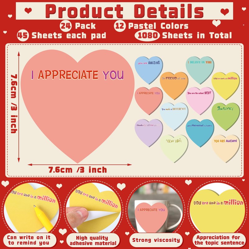 - Adequate Quantity and Styles: you will receive 24 pads of heart shape inspirational sticky notes, including 12 colors, two pad for each color, 45 sheets for each pad, a total of 1080 sheets; Sufficient quantity, various styles, can meet your various needs, you can also share with your family and friends