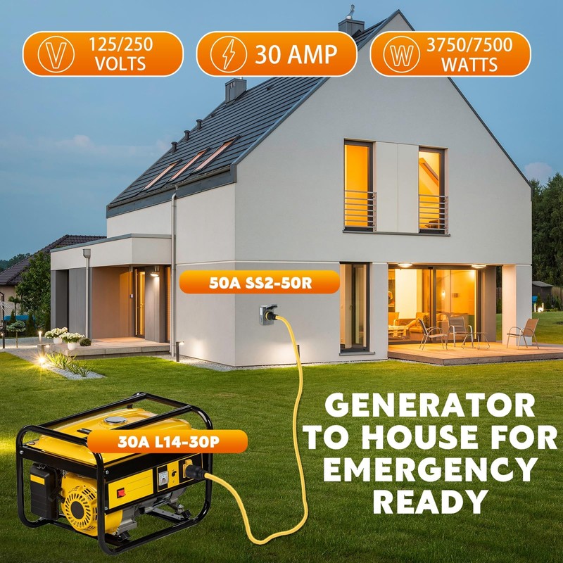 - Universal Compatibility: connect seamlessly with our 10ft NEMA L14-30P to NEMA SS2-50R adapter cord, crafted for versatility. Whether powering up a 30A generator, hooking to your RV's 50A inlet, or linking to your home's 50A inlet box, our adapter offers a flawless fit for both 125V and 250V systems, supporting up to a 30 Amp load