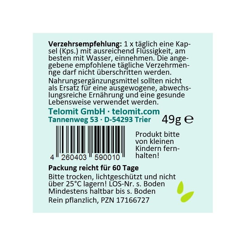 ProduktbeschreibungMeeresbraunalge Ascophyllum nodosum (Knotentang). vegan - lactosefrei - glutenfrei. 1 vegane Kapsel enth?lt: Ascophyllum nodosum 818 mg. Aus nachhaltig bewirtschafteten nordatlantischen algengebieten, getrocknet und schonend in Partikel gebrochen. berzugsmittel: Hydroxypropylmethylcellulose.Inhaltsstoffe / ZutatenBio-Ascophyllum nodosumWarnhinweiseDas Produkt au?erhalb der Reichweite von Kindern aufbewahren.Rechtliche HinweiseNahrungserg?nzungsmittel sollten nicht als Ersatz fr eine ausgewogene, abwechslungsreiche Ern?hrung und eine gesunde Lebensweise verwendet werden.Anschrift Hersteller/ImporteurTelomit GmbH, Tannenweg 53, 54293 Trier, Deutschland, E-Mail: gf@telomit.com