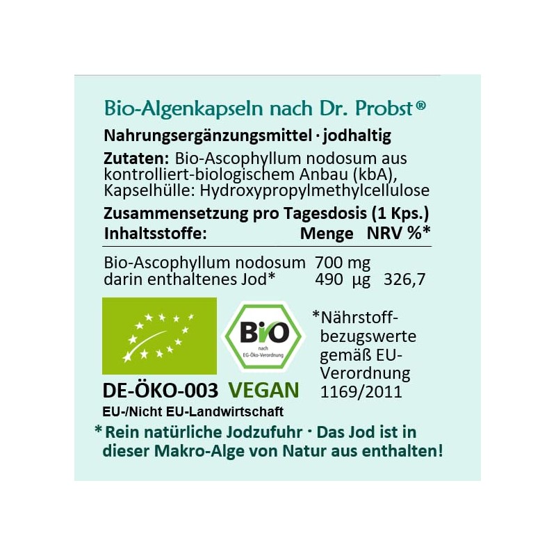 - 100 % VEGAN Schonende, unerhitzte Verarbeitung Glutenfrei, lactosefrei, geschmacksneutral Ohne weitere Zutaten, Hilfs- oder Fllstoffe Natrliche Jodquelle