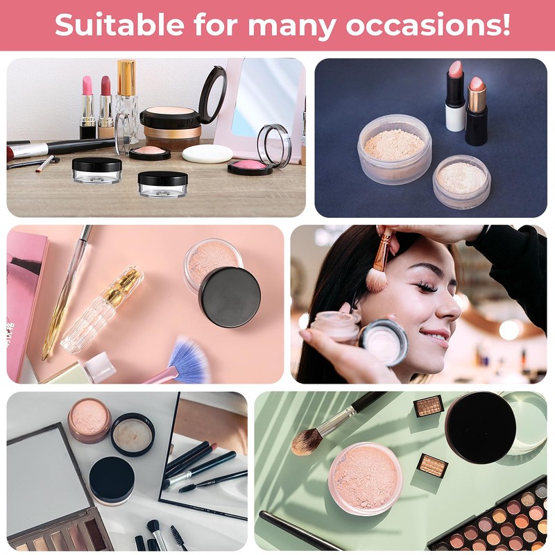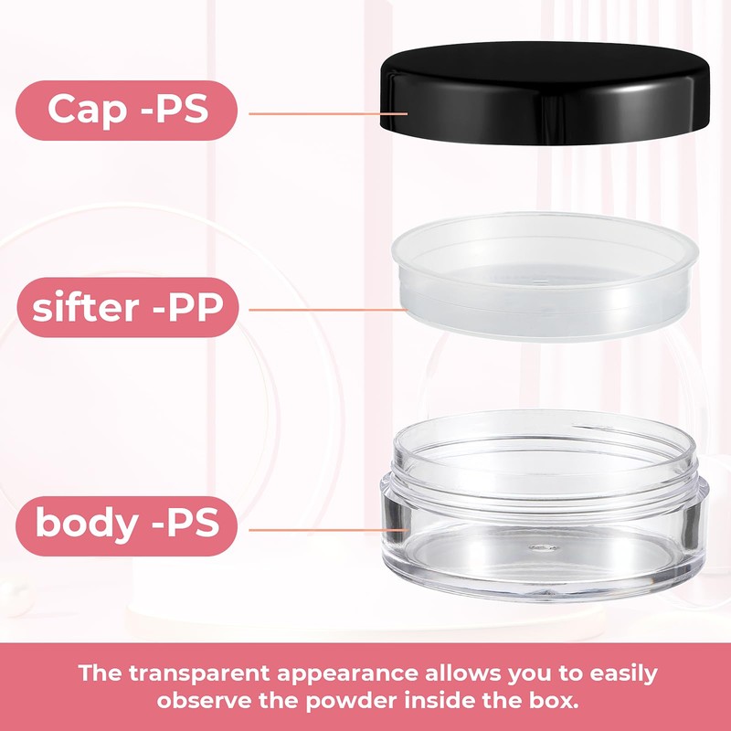 - 【Package Content】4 loose powder cans, the black lid and transparent bottle design are both fashionable and practical. This sufficient packaging quantity ensures that you can diversify packaging and easily meet the requirements of different occasions. Whether travelling, daily make-up or for a special party with empty powder boxes, you can flexibly create individual make-up and show your own style if necessary