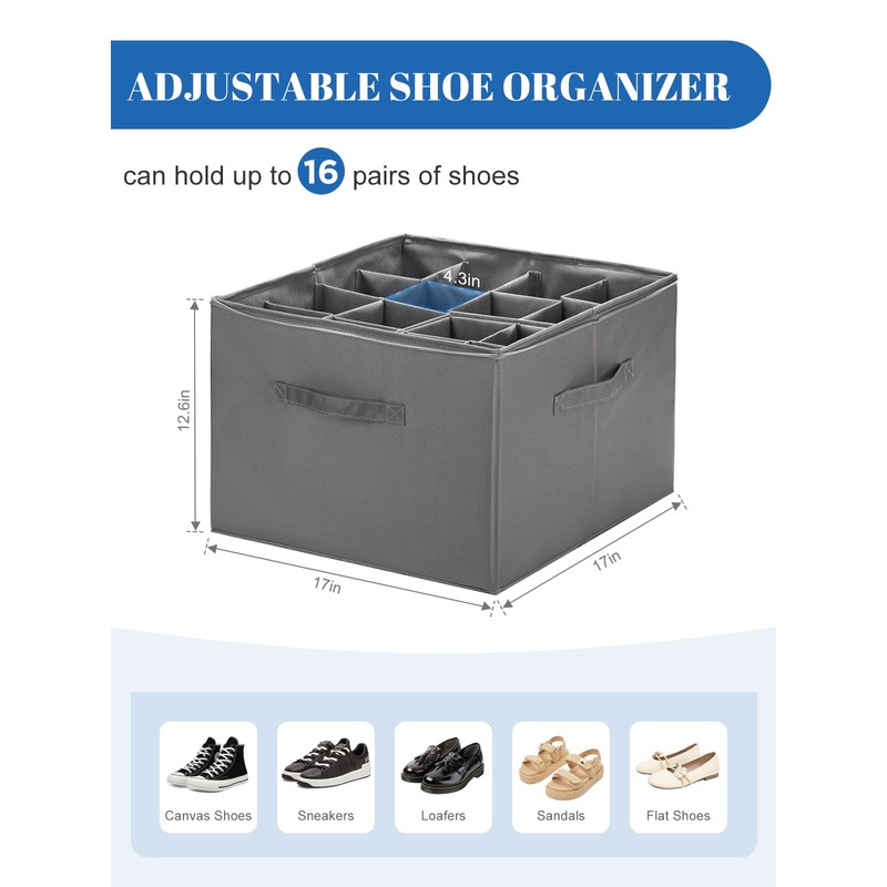 - VERSATILE USAGE: Adjustable compartments make this fabric shoe box incredibly versatile. Beyond storing shoes, use this multi-purpose closet shoe organizer to organize clothes, fabrics, bedding, blankets, books, and more. One box, endless possibilities—keep your home organized and clutter-free with this adaptable storage solution.