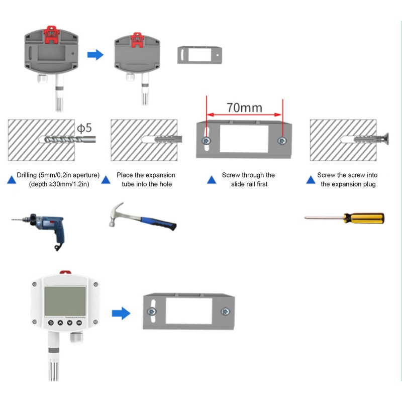 1、Better Sensor: Able to detect temperature and humidity with high accuracy, the transmitter allows for flexible application. 2、Clear Display: LCD screen enables clear digital display as well as more convenient operation to save your time and labour. 3、Reliable Work: Combining dedicated analogue circuit and 10‑30V wide voltage input, the temp meter has excellent durability. 4、Simple to Use: You can easily set the parameters through the buttons, and the good dust protection ensures high work safety. 5、Easy to Install: The light weight together with compact size largely simplifies both wall mount and slide rail installation.