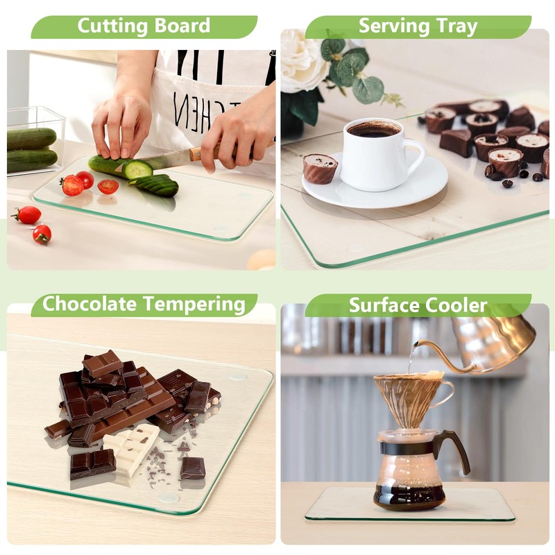 - [Heat Resistant]With high heat resistance, Tempered glass cutting board can not only be used for preparing dishes, but also soup pots, hot pans or baking trays can be placed on glass cutting mat. It's a perfect countertop heat protector.