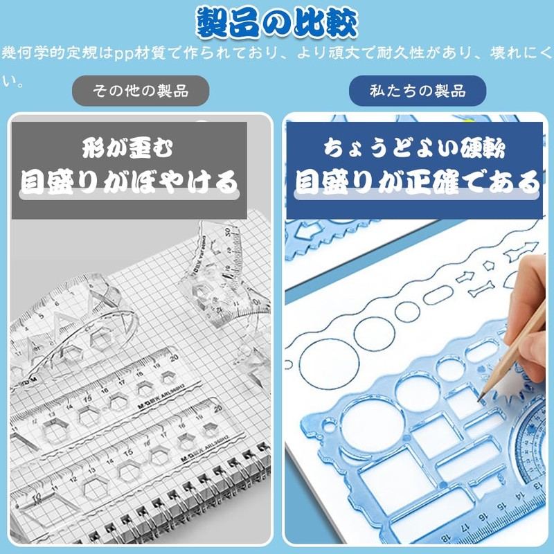 - Geometric ruler is made of pp material, more sturdy, durable and not easy to break. Rounded edges and smooth for fine work and won't hurt your hands 7 different rulers for you to choose. Washable and reusable