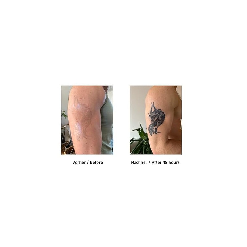 - The application is similar to conventional temporary tattoos. Simply cut the tattoo to size, press the transparent side on the desired skin area and press on the skin with a little water for 15 seconds. Done! The side with image is for positioning only.