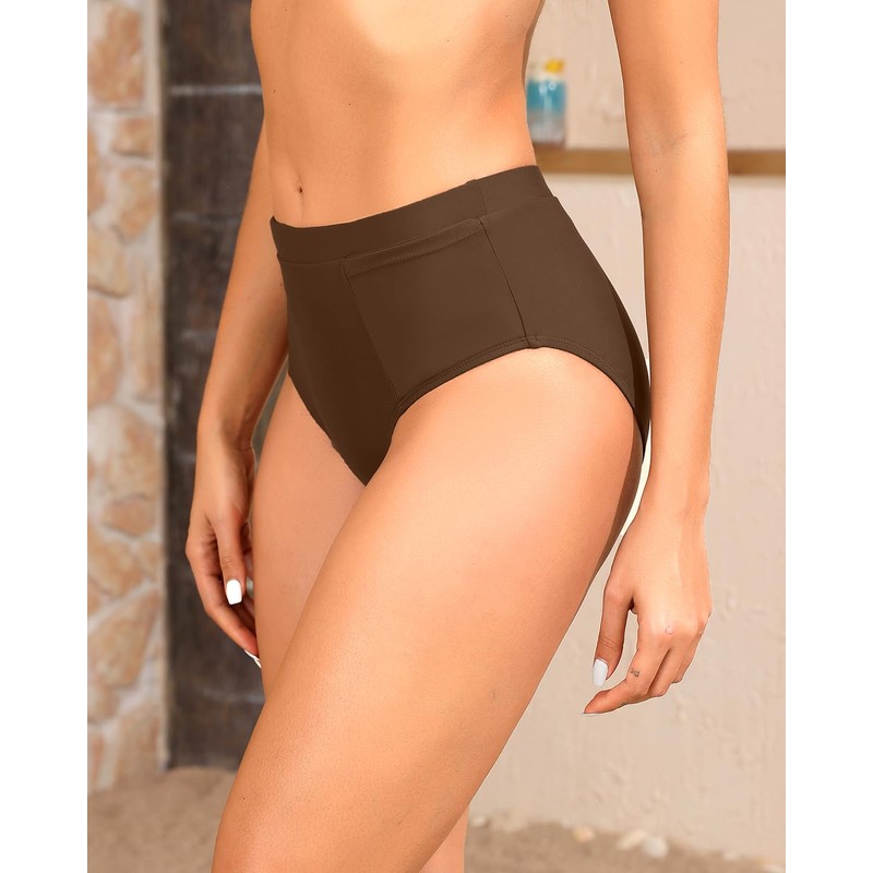 Tempt Me Mid Waist Brown Bikini Bottoms-Full Coverage Bathing Suit Bottom with Pockets S