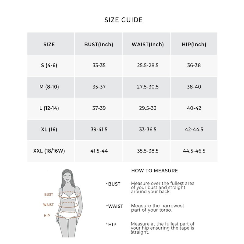 - Disponible en una variedad de tallas de EE. UU.: S (EE.UU. 4-6), M (EE.UU. 8-10), L (EE.UU. 12-14), XL (EE.UU. 16), XXL (EE.UU. 18). Por favor, selecciona la talla adecuada de acuerdo con las medidas detalladas a continuación antes de comprar.