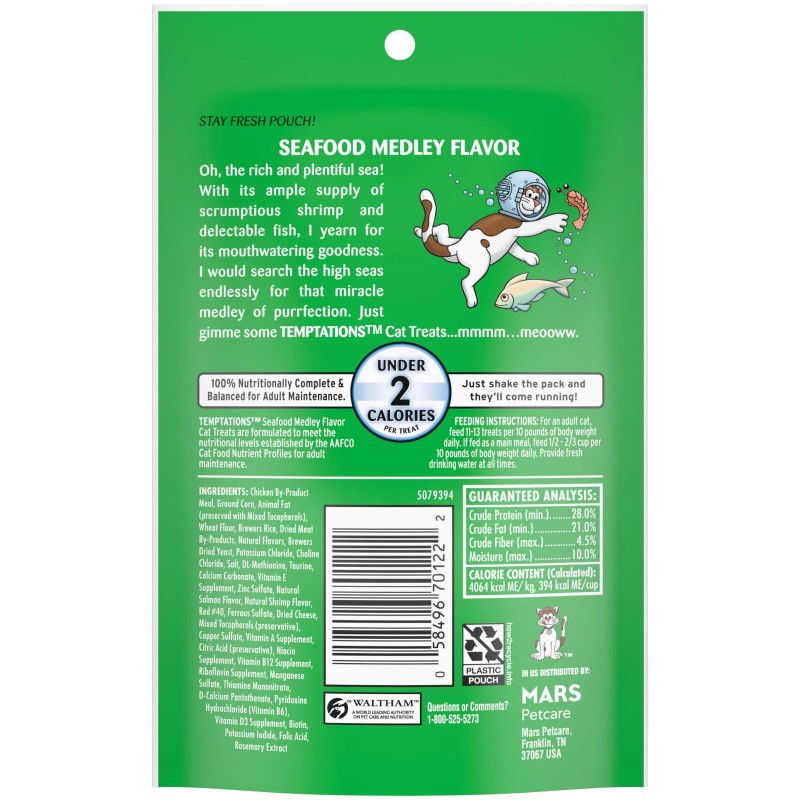 Cats love the delicious, crunchy taste of Temptations cat treats, so give your cat purr-worthy Temptations Classic Crunchy and Soft Cat Treats Seafood Medley Flavor, and they’ll come running the moment you open the pack. Each of these seafood-flavored cat treats has less than 2 calories and provides an irresistible combination of both crunchy and soft textures. They also come in a stay-fresh tub, so your feline friend can enjoy their favorite cat snacks when you open it, but not when they shouldn’t! These Temptations Classic Cat Treats are a perfect addition to your cat’s regular feeding routine: Use them as cat treats, meals, or as cat food toppers. Temptations Classic Crunchy and Soft Cat Treats are the purr-fect way to show your feline friend how much you care.