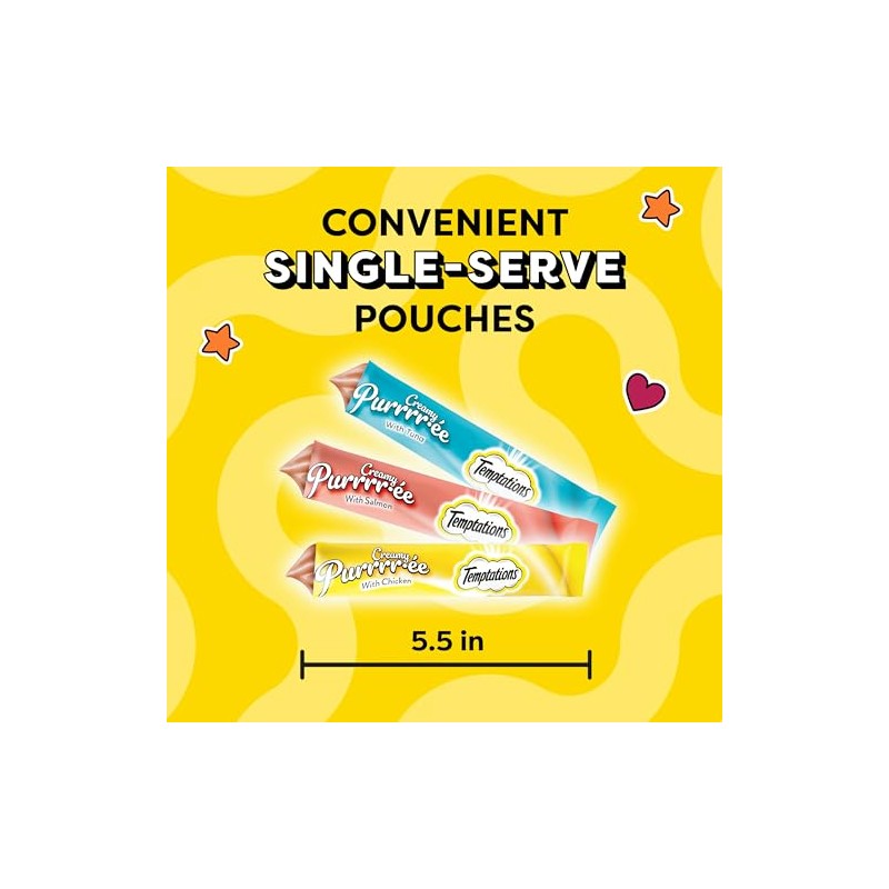 Treat time is your cat's favorite time of day. Make it even more purr-fect with Temptations Creamy Puree Squeezable Lickable Wet Cat Treats with Chicken, with Salmon, or with Tuna. These irresistible and squeezable wet cat treats deliver the delicious chicken, salmon, or tuna taste cats love in the perfectly creamy texture they can't get enough of! Serve these lickable cat treats by hand for a playful bonding moment, in a bowl as a cat snack, or as an extra special cat food topper to make mealtime fun! The possibilities are endless with this interactive cat treat! Plus, these lickable wet cat treats come in a single-serve cat treat tube for conveniencejust open, squeeze, and serve! Temptations Creamy Puree is made with real chicken, with real salmon, or with real tuna and has no added sugar, fillers, or artificial preservatives (Trace amounts may be present due to potential cross-contact during manufacturing). Whether your furry friend is an adult or senior, these fun squeezable wet cat treats are the perfect cat snack at less than 15 calories per pouch. We're paw-sitive that your cat will enjoy the delicious taste of Temptations Creamy Puree Squeezable Lickable Wet Cat Treats!