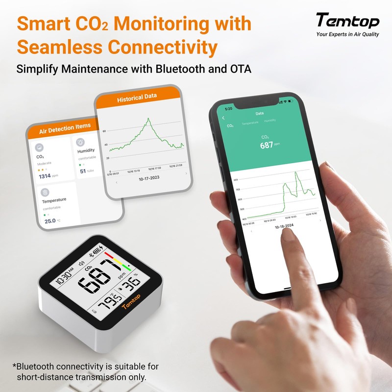 - Precise CO2 monitoring for a healthy indoor climate: The Temtop CO2 detector with Sensirion sensors and app connection provides an exact measurement of CO2 concentration, temperature and humidity. You can monitor air quality not only directly on the device, but also conveniently via your smartphone - for a healthy home or office.