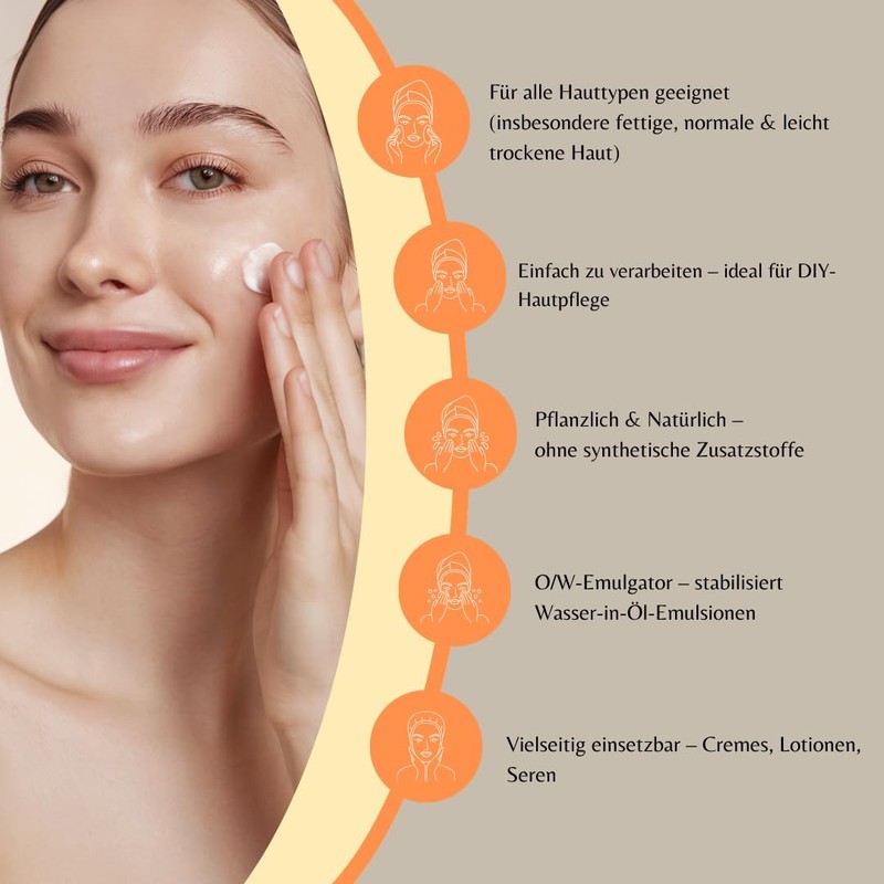 - ✅ Vielseitig einsetzbar – Egal ob Gesichtscreme, Körperlotion oder Handpflege – dieser pflanzliche Emulgator sorgt für eine langanhaltende Konsistenz und ein angenehmes Hautgefühl. Ideal für Anfänger & Profis in der Naturkosmetik.