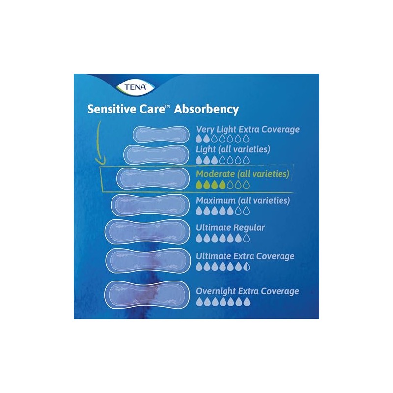 TENA Sensitive Care Moderate Regular Incontinence Pads are 100% breathable to help protect your sensitive, intimate skin when experiencing bladder leakage. These pads are designed with triple protection against bladder leaks, odor, and wetness for occasional moderate urine leakage. As opposed to period pads, these absorbent urine pads protect against moderate leaks from stress incontinence.