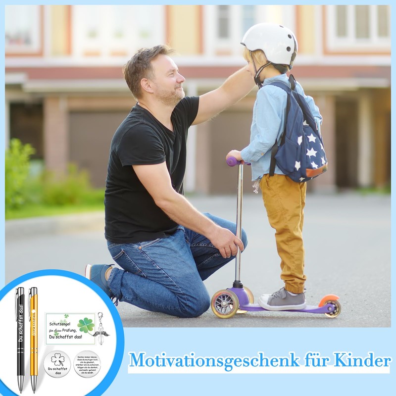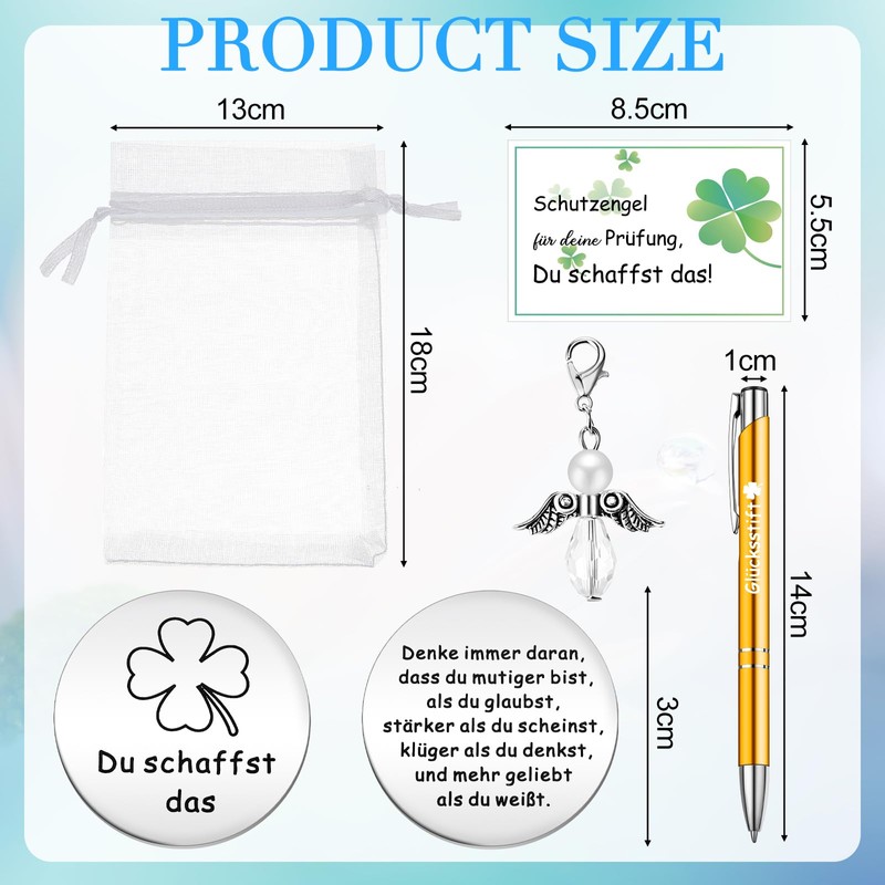 - Beautiful meaning: this courage gift combines aesthetics and meaning; the pen, card and lucky coin are all decorated with motivational sayings such as "Du schaffst das" and symbolise trust and support for the recipient; the four-leaf clover pattern represents your good wishes for the recipient; In addition, there is a guardian angel pendant that accompanies and protects the recipient