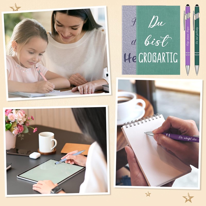 - UNIQUE DESIGN Each pen and notepad with sayings contains carefully designed, meaningful German inspirational quotes. For example, [Difficult paths often lead to beautiful goals], [You're great]. Suitable for people of different ages, add encouragement and strength to your daily writing, give them your encouragement and appreciation, add fun and positive energy to your daily life