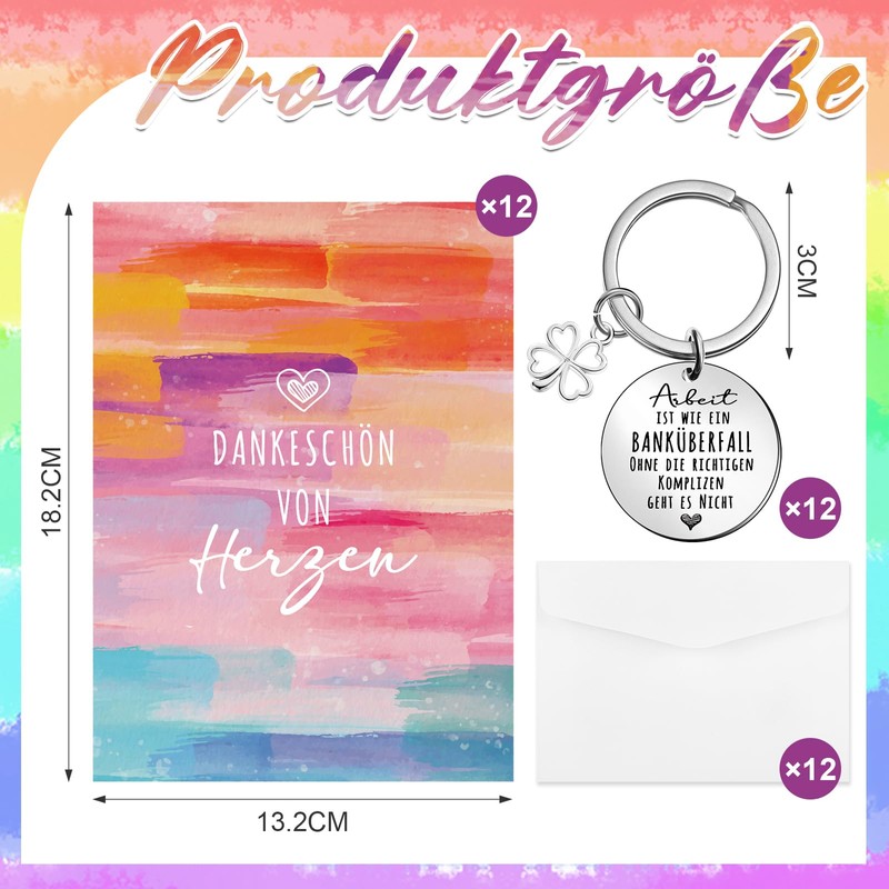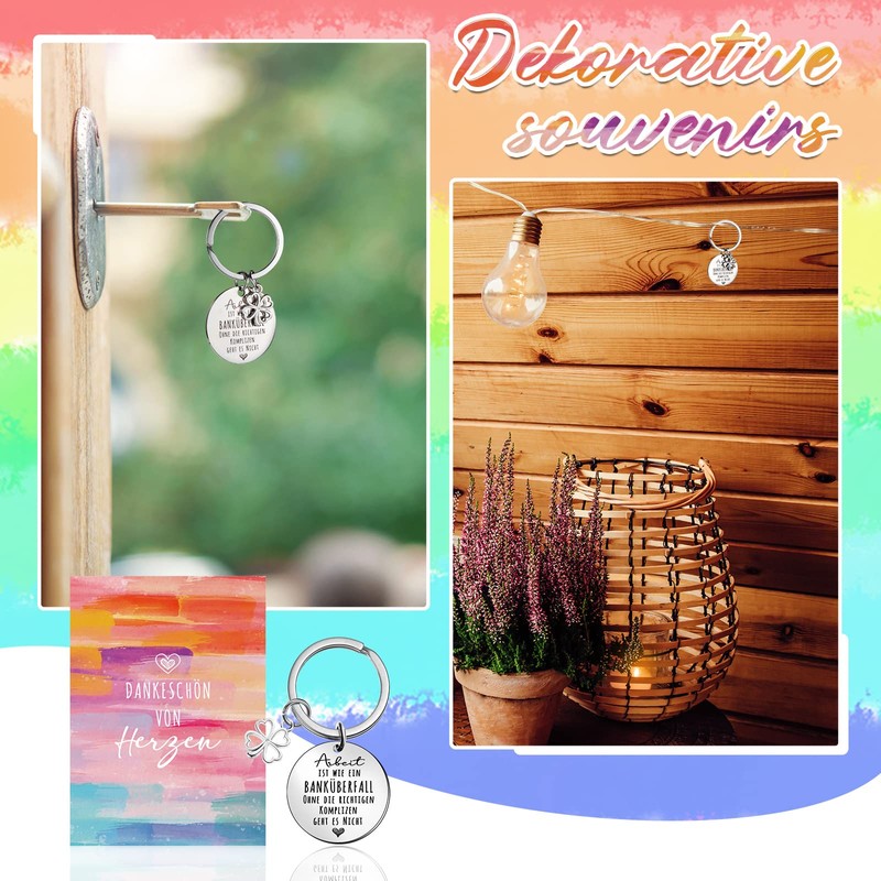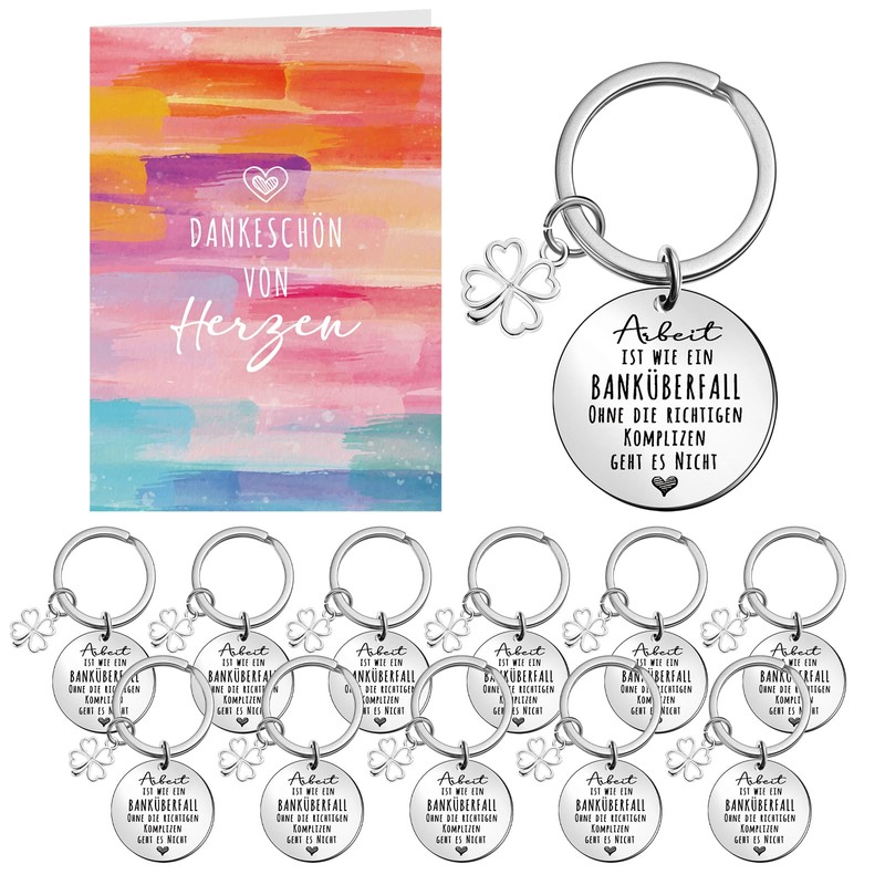 - Unique design: the keyrings for colleagues are decorated with a humorous saying "Work is like a bank robbery, without the right accomplices it doesn't work"; As lucky charms, the keyrings are also equipped with four-leaf clover pendants that symbolize your best wishes; In addition, there is a thank you card with the message "Thank you from the heart"; This lovingly designed design spreads joy and warmth