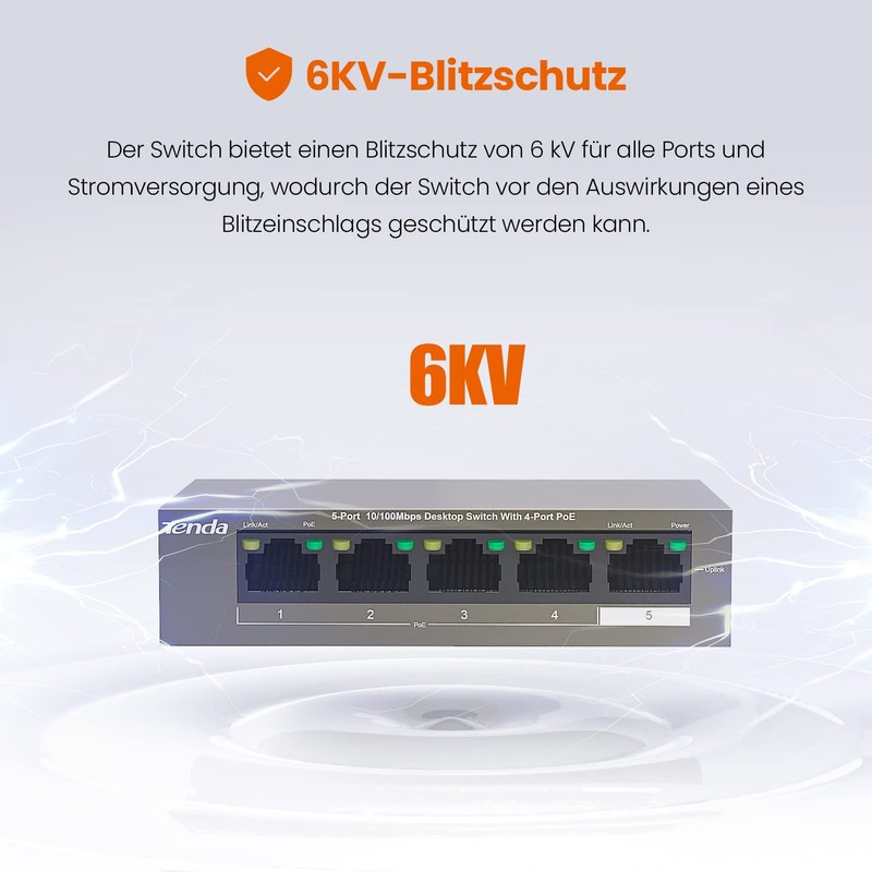 - Lightning protection: PoE switch supports 6 kV lightning protection, which can protect the switch from lightning strikes caused by thunderstorms