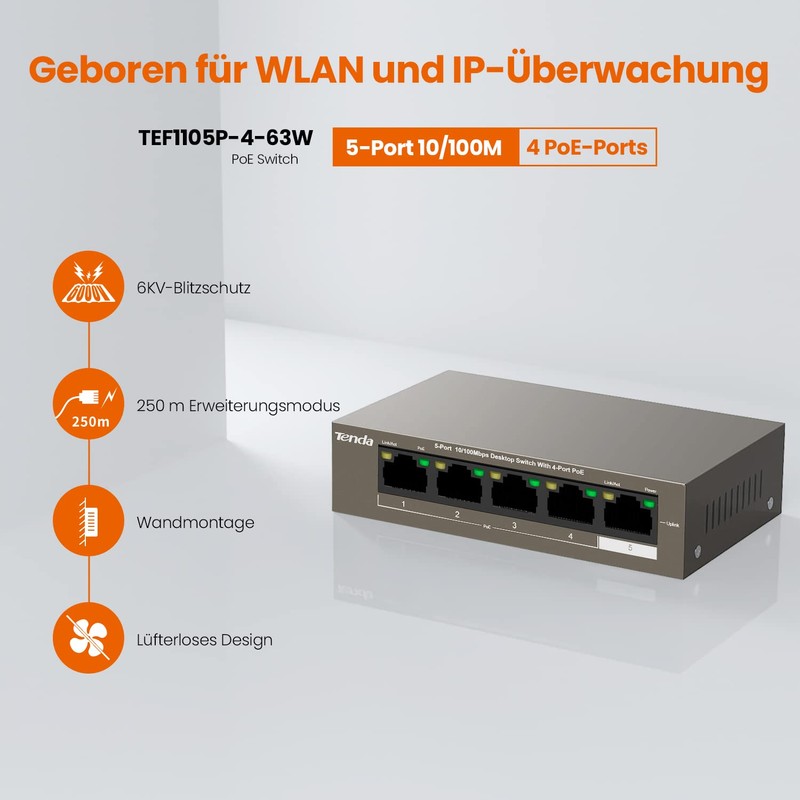 Tenda 5 Port Fast Ethernet PoE Switch mit 4 PoE+ Ports & 1 Uplink-Port (58W, IEEE-802.3af/at, 250 Meter, Plug & Play, Metallgehäuse)(TEF1105P-4-63W)