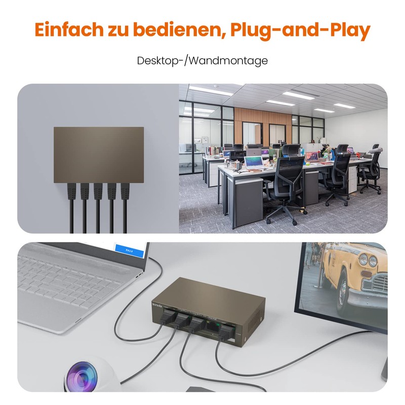 - Up to 250 m range: Thanks to the extension mode, the PoE switch has a maximum range of up to 250 metres and can access remote PoE devices such as APs, cameras and VoIP phones. Particularly suitable for the use of IP cameras in large areas