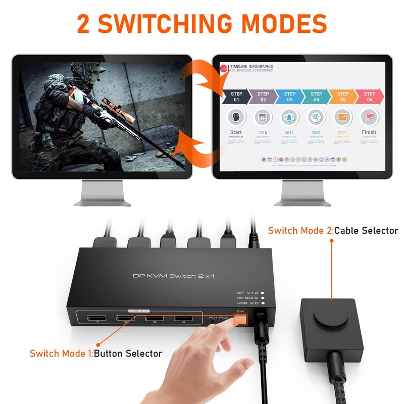 - Easy to Switch Input Device (Two Ways) - Using the extended switch button with 4.92ft(1.5M) cable, enough length for you to arrange your cables and keep the switch button close at hand (Recommend); Or push button on the KVM switch to select the DisplayPort input device. This KVM DisplayPort switch does not support keyboard hotkey switch, reduce keyboard key conflicts and make the device run more smoothly.