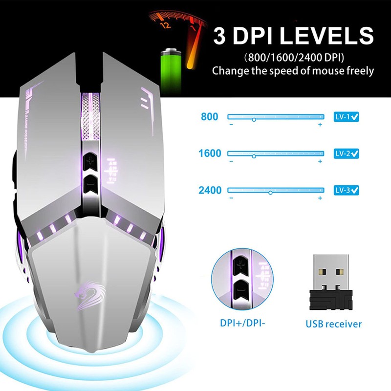 - Plug and Play: Comes with a USB receiver( stored in the package with charging cable), plug and play, no other driver required. 3 adjustable DPI (800,1600,2400)-control your cursor speed freely to meet different demand.