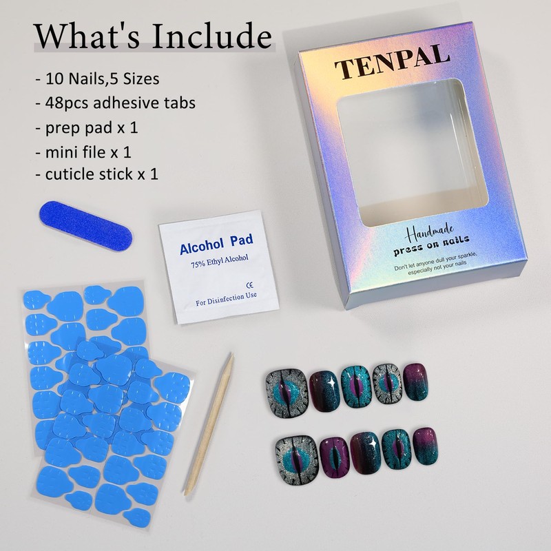 TENPAL Cat Eye Press On Nails 10 Pcs with Tools Kit - Handmade Purple Blue St...