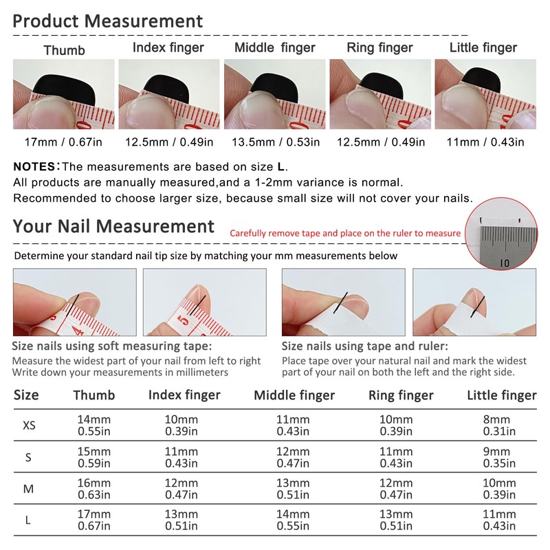 • [How to use and how to remove]: Measure your own nail length according to our size chart and choose the size that best suits you. After receiving acrylic press on nails, follow our instructions. So that fake nails can last for many days. However, as professionals, we do not recommend that you wear it for a long time. Just like makeup, we hope that you can give your fingernails more breathing space.