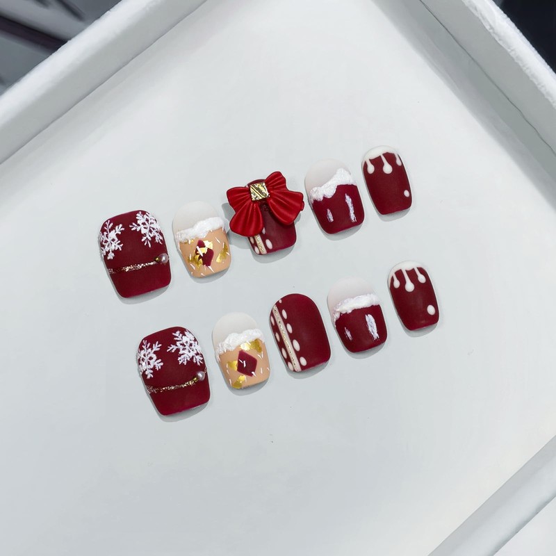 TENPAL Christmas Press on Nails Short Square Handmade Matte Red Nails Press Ons Acrylic White Snowflakes Fake Nails with Glue Xmas Full Cover False Nail 10pcs/box New Year Stick on Nails for Women(L)