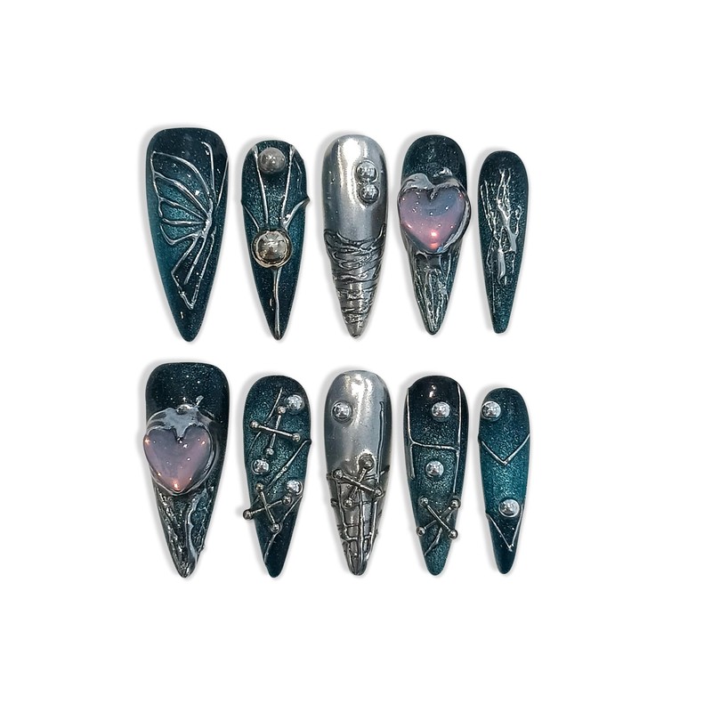 TENPAL Handmade Press on Nails Long Stiletto,Galaxy Ombre Blue-Black Fake Nails with 3D Butterflies Cross Beads Gem Stones,Edgy Y2K Metal Embossed Meteor Glitter Design Salon False Nail Kit 10pcs(L)