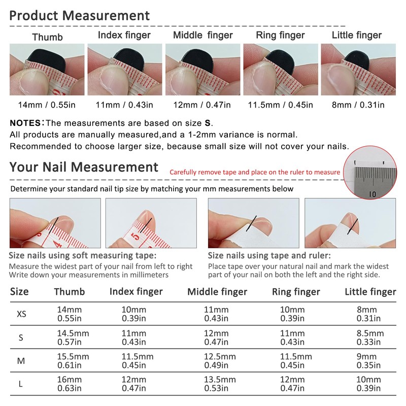 - [How to use and how to remove]: Measure your own nail length according to our size chart and choose the size that best suits you. After receiving acrylic press on nails, follow our instructions. So that fake nails can last for many days. However, as professionals, we do not recommend that you wear it for a long time. Just like makeup, we hope that you can give your fingernails more breathing space.