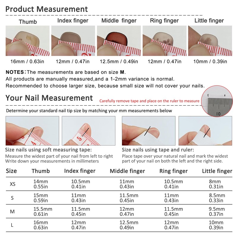 - [How to use and how to remove]: Measure your own nail length according to our size chart and choose the size that best suits you. After receiving acrylic press on nails, follow our instructions. So that fake nails can last for many days. However, as professionals, we do not recommend that you wear it for a long time. Just like makeup, we hope that you can give your fingernails more breathing space.